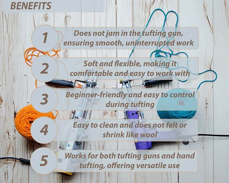 Unlike wool, this acrylic yarn for tufting does not felt or shrink and is easier to clean, making it ideal for functional rugs and decorative carpets.